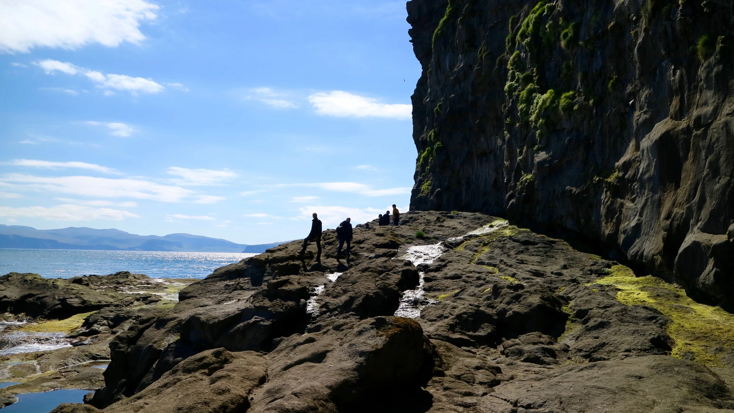 Bright sunshine, wind blowing in the right direction, 9.5 knots, sailing under canvas from Tórshavn to Stóra Dímun. Coordinates: 61° 41' 49" N, 6° 44' 56" W. Population: 7. Access: exclusively by helicopter – usually. We approach the island in a dinghy, bird-commotion all over the steep face next to us. Off we go! First task: managing an obstacle course. Boulder-jumping, to be more precise. Next: climbing up polished volcanic rock with the help of a rope. After that: the slope, clinging to tufts of grass, up and up, stepping in old puffin burrows.